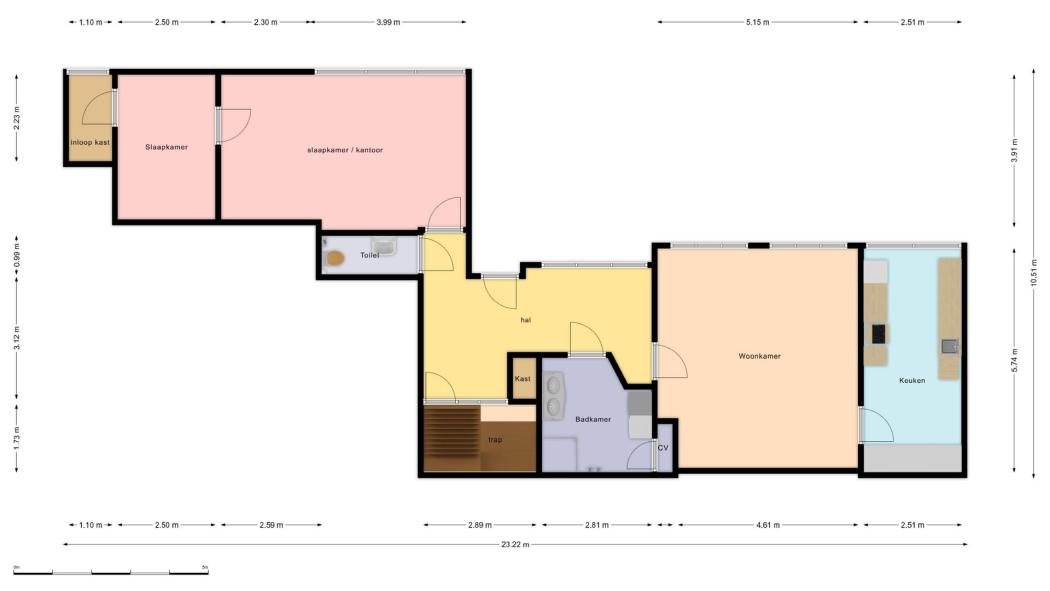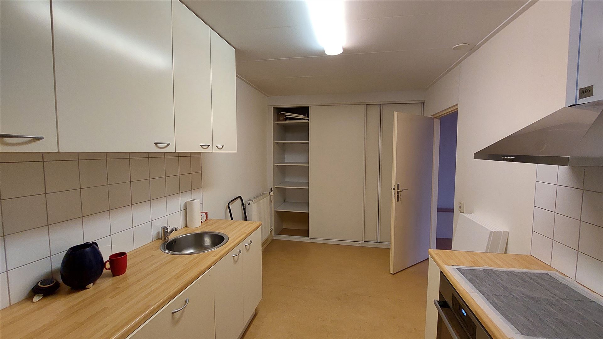 In de verwarmde keuken staat ook nog een kast met drie schuifdeuren. Kast is 70 cm diep, dus veel kastruimte. Marmoleum op de vloer.